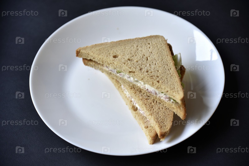 Сэндвич с мясом и соусом на белой тарелке. Вкусный легкий завтрак