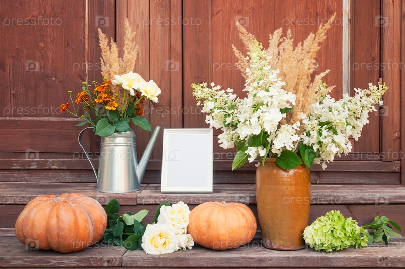 Рамка, букет белых роз, гелениума и сухой травы, букет гортензии и сухой травы, тыквы и белые розы на ступенях деревенской деревянной лестницы