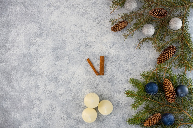 Елочные шары со свечами, с шишками на сером фоне. Выборочный фокус. Место для копирования. вид сверху. Рождество, новогодняя открытка