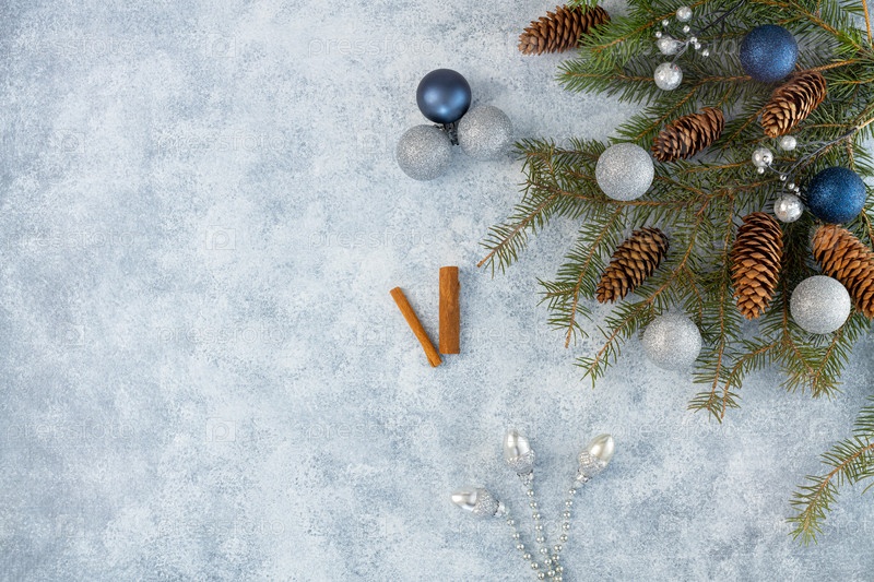 Елочные шары со свечами, с шишками на сером фоне. Выборочный фокус. Место для копирования. вид сверху. Рождество, новогодняя открытка