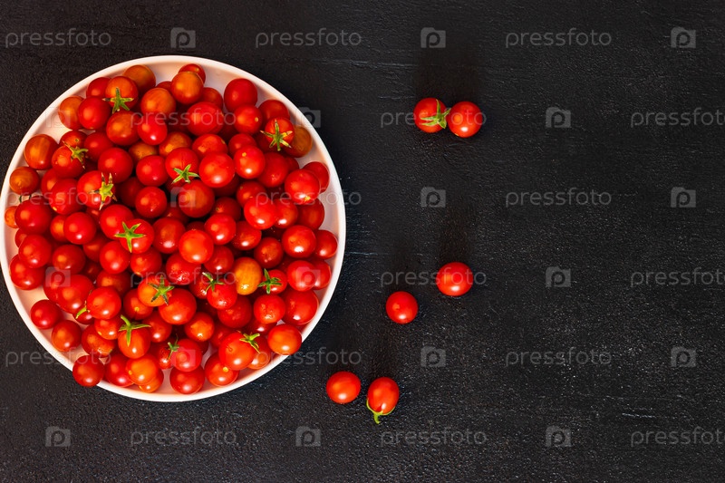 Красные помидоры черри в светлом блюде на темном фоне, вегетарианский продукт, здоровая пища. копировать пространство