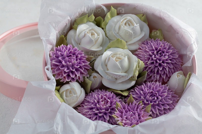 Зефирный букет цветов в подарочной коробке на светлом фоне, День святого Валентина