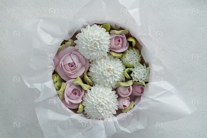 Зефирный букет цветов в подарочной коробке на светлом фоне, вид сверху, праздничная концепция, День святого Валентина