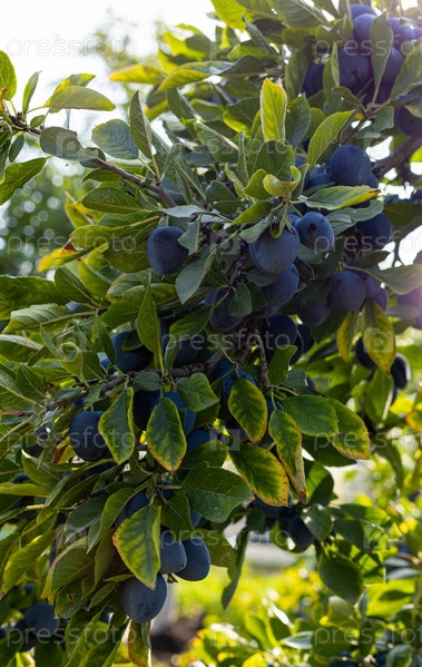 Спелые голубые фиолетовые сливы и зеленые листья на ветке