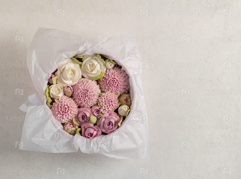 Зефирный букет цветов в подарочной коробке на светлом фоне, вид сверху, праздничная концепция, День святого Валентина