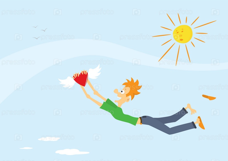 Влюбленный человек схватился за сердце с крыльями и летит по небу