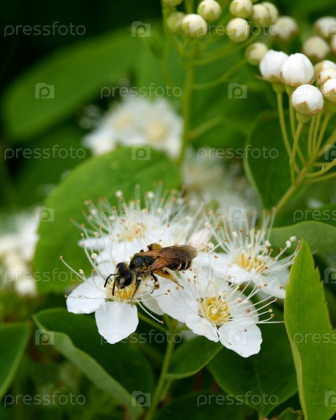 Пчела сидит на цветущей спирее весенним днем