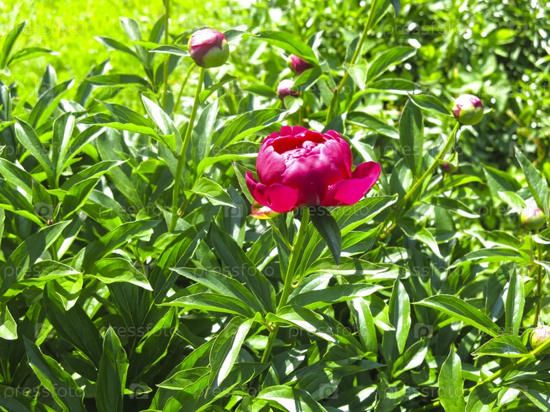 Яркий бордовый пион зацветает весной
