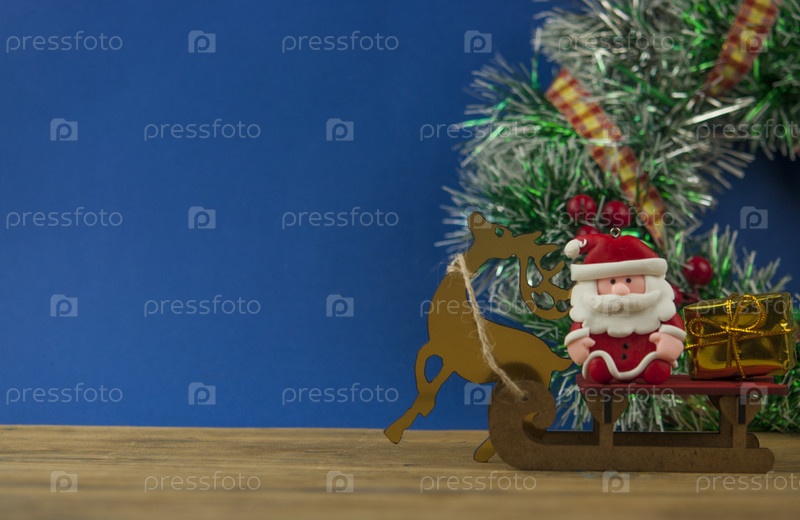 Новогодняя и рождественская открытка, дед мороз и северный олень с подарками на санях, концепция