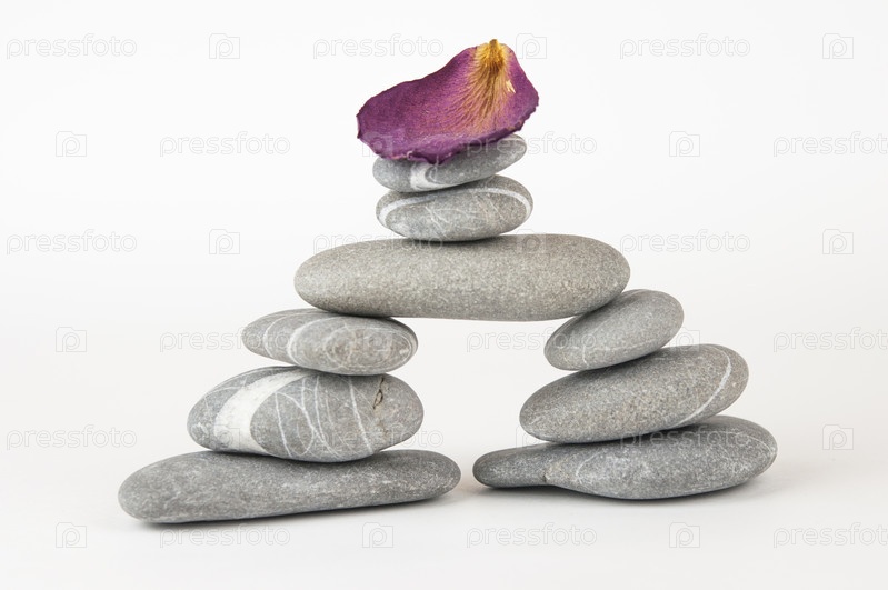 Пирамида из морской гальки на белом фоне. Концепция жизненного баланса и гармонии