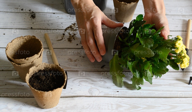 Женские руки пересаживают цветок в другой горшок на столе. Домашнее садоводство