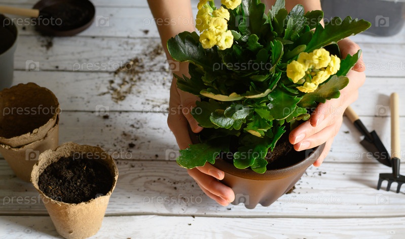 Женские руки пересаживают цветок в другой горшок на столе. Домашнее садоводство