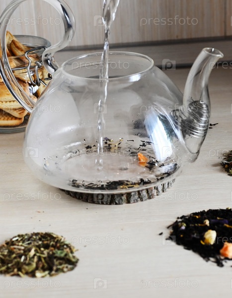 Набор разных видов чая рядом с чайником, наполненным горячим заваренным чаем на бежевом фоне