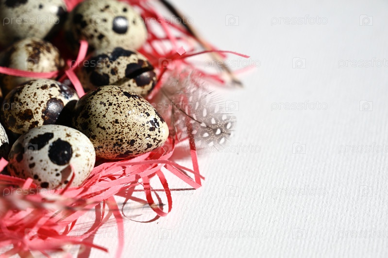 Куча перепелиных яиц, украшенных перьями. Органическая еда. Деревенский стиль. Вид сверху