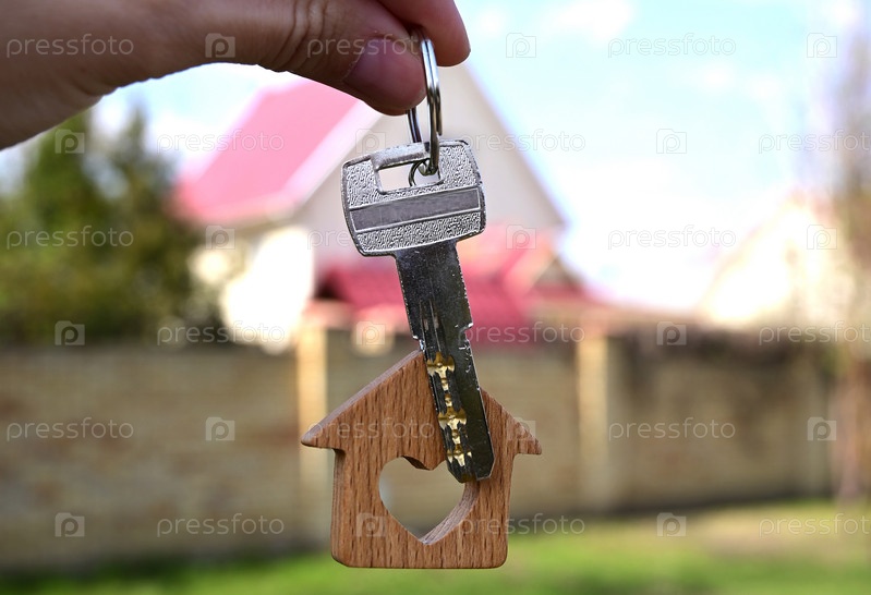 Женщина держит в руке ключ от нового дома. Одобрение ипотечного кредита Жилищный кредит
