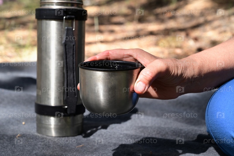Руки наливают чай из термоса в лесу на пикнике