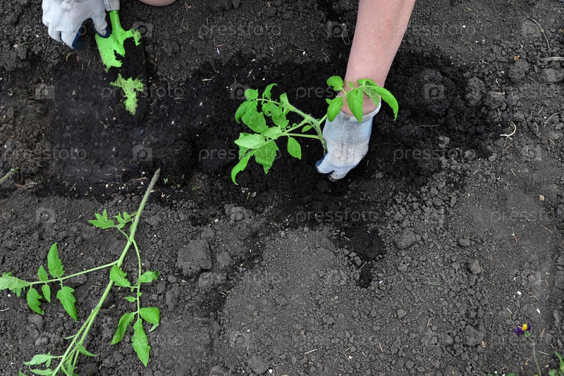 Ребенок ухаживает за растением и поливает его. Детская рука подсыпает землю под куст зеленых помидоров, чтобы помочь ему вырасти и защитить его. Концепция ухода за растениями и выращивания органических продуктов