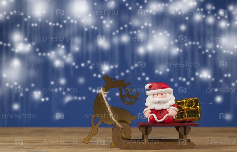 Новогодняя и рождественская открытка, дед мороз и северный олень с подарками на санях, концепция