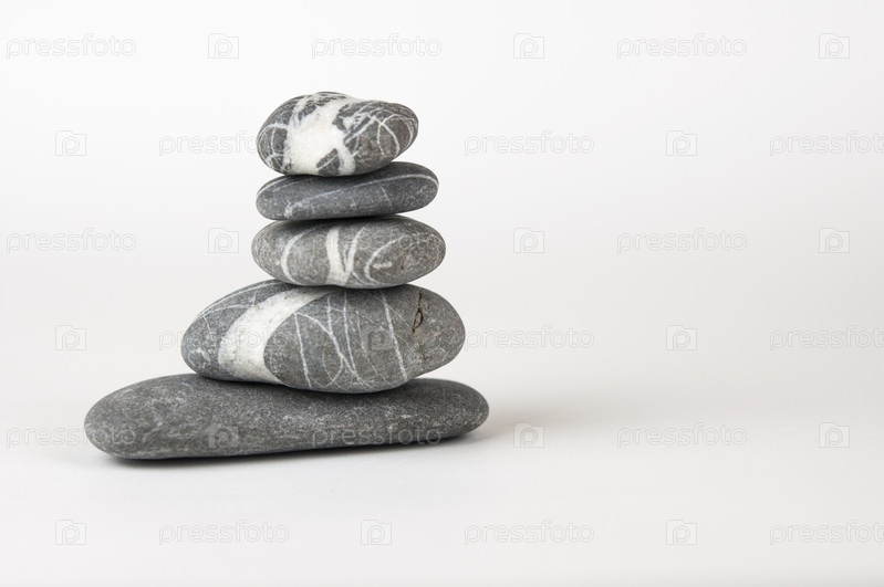 Пирамида из морской гальки на белом фоне. Концепция жизненного баланса и гармонии