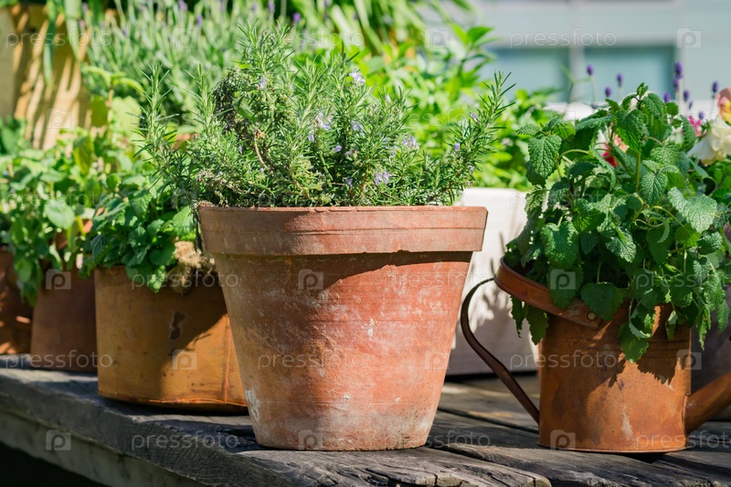 Различные травы в ржавых металлических горшках и банках, стоящих на деревянном столе на открытом воздухе - украшение для сада