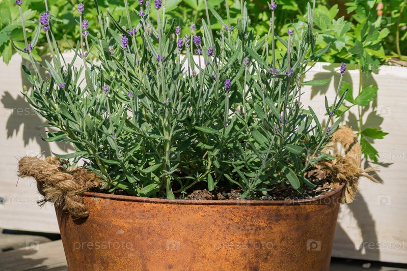 Украшение сада - цветущая лаванда в металлическом ржавом горшке на открытом воздухе