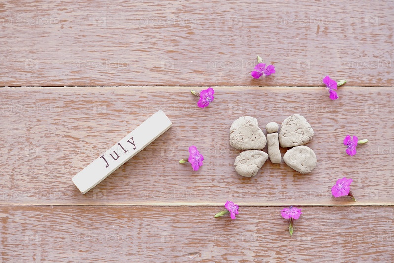 Вид сверху деревянного календаря со знаком июля, глиняной бабочкой и розовыми цветами