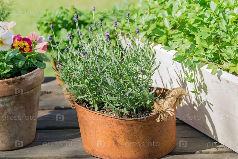 Цветущие цветы и травы в деревянных, глиняных и металлических горшках на открытом воздухе. украшение сада