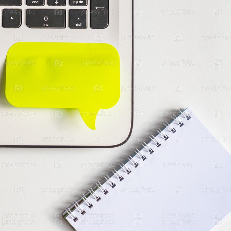 Ноутбук, блокнот и желтая наклейка на белом фоне, бизнес-концепция с копировальным пространством. Вид сверху, плоская планировка
