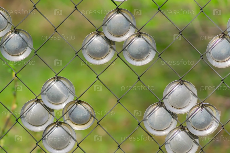 Металлический забор украшен металлическими кругами на фоне зеленой травы
