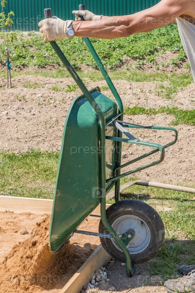 Мужчина держит тачку для перевозки песка