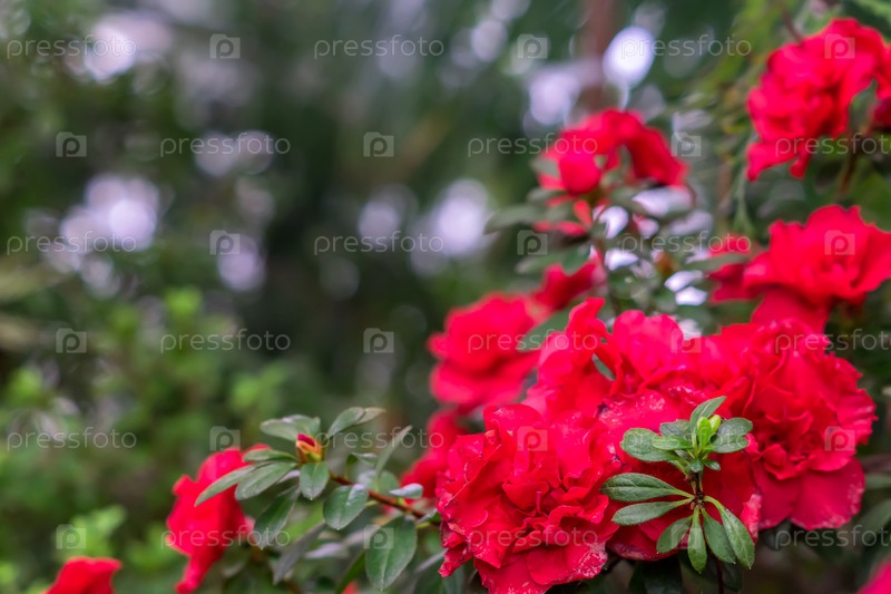 Красные цветы рододендрона, в саду растут азалии