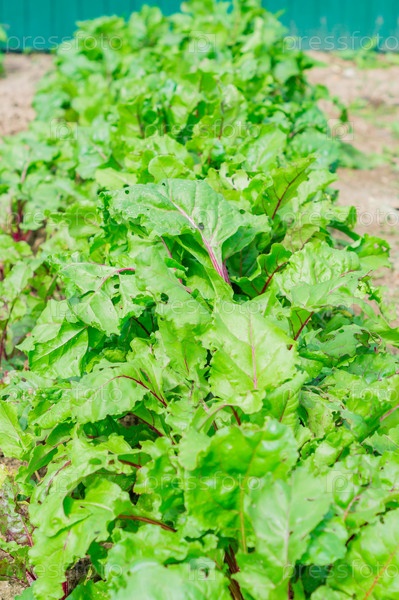 Зеленый с красными полосами ботва свеклы в саду