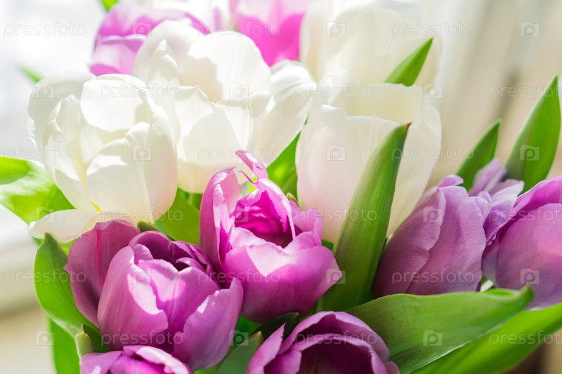 Белые и фиолетовые цветущие тюльпаны. цветочный фон