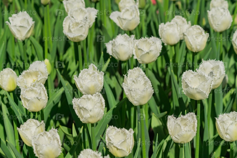 Цветущее поле белых тюльпанов в саду, цветочный фон
