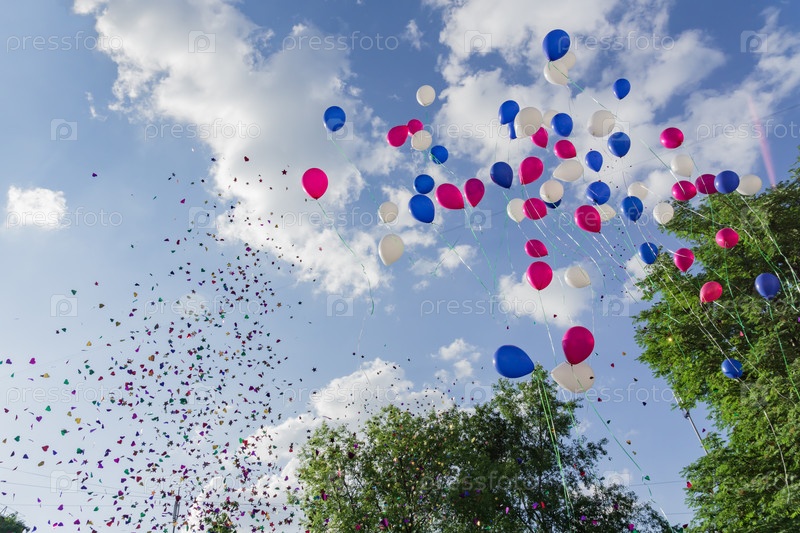 Разноцветные воздушные шары и конфетти выпущены в голубое небо на фоне деревьев. Праздничное действо