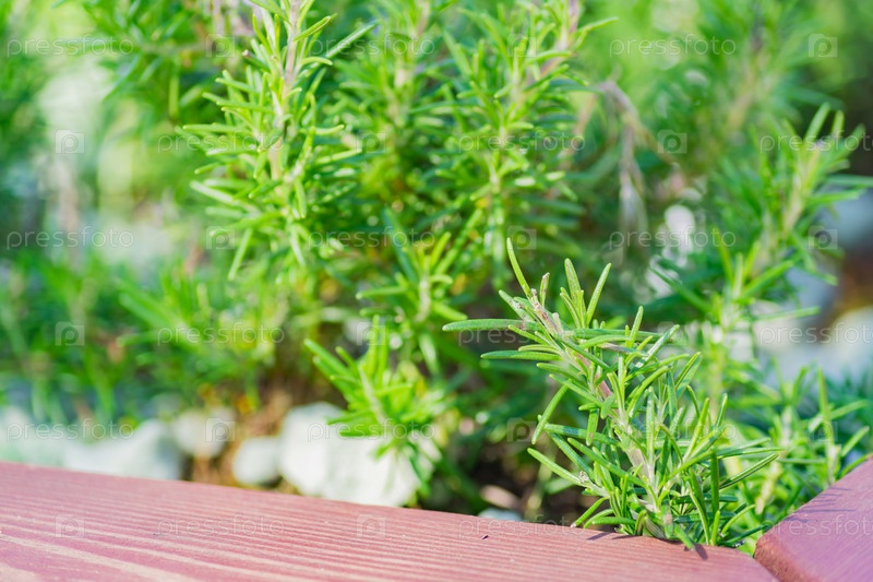 Молодой куст розмарина на клумбе в саду, на открытом воздухе, выборочный фокус