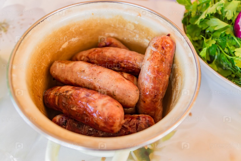 Колбаски на гриле в кастрюле или на открытом воздухе. ужин в деревенском стиле
