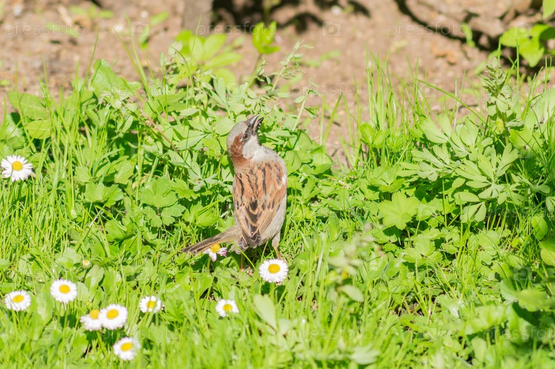 Милый воробей сидит в зеленой траве в парке, дикая природа