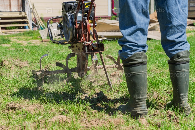Фермер в резиновых сапогах и синих джинсах пашет землю небольшим моторным трактором
