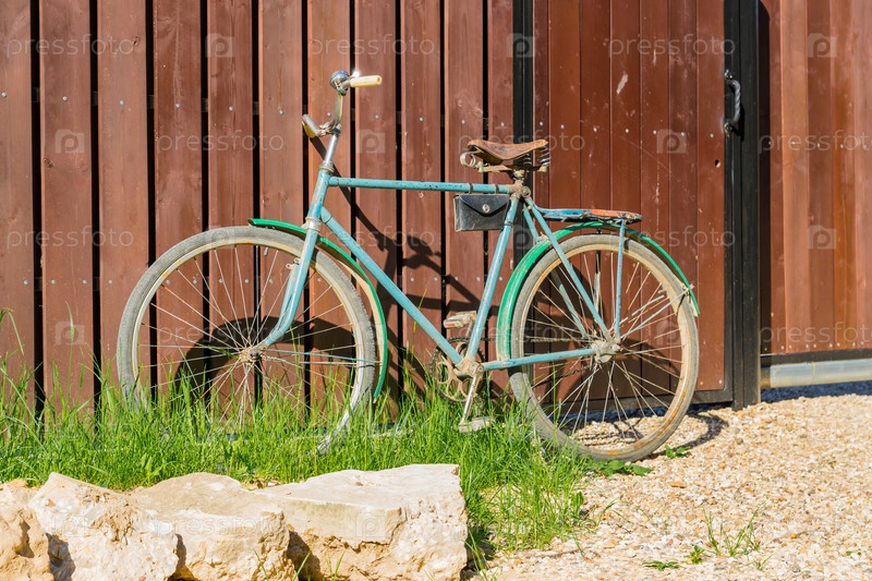 Старый велосипед, припаркованный у деревянного забора, загородный пейзаж