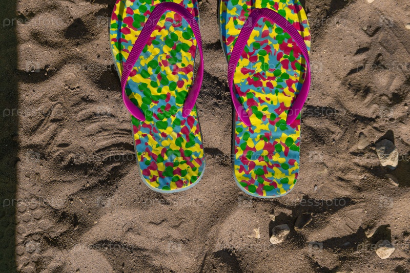 Разноцветные шлепанцы на песке с нарисованной формой сердца. Концепция отпуска
