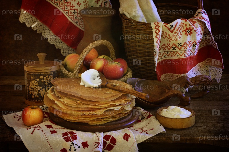 Натюрморт с блинами,сметаной и яблоками. Масленица