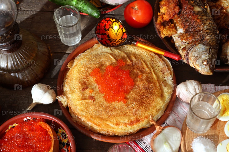 Блины, икра, закуски и водка на праздничном столе