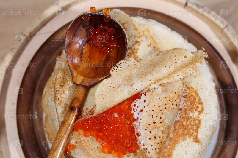 Блины с красной икрой на деревянном фоне