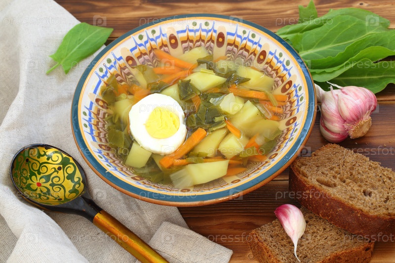 Зеленый борщ со сметаной и ржаным хлебом