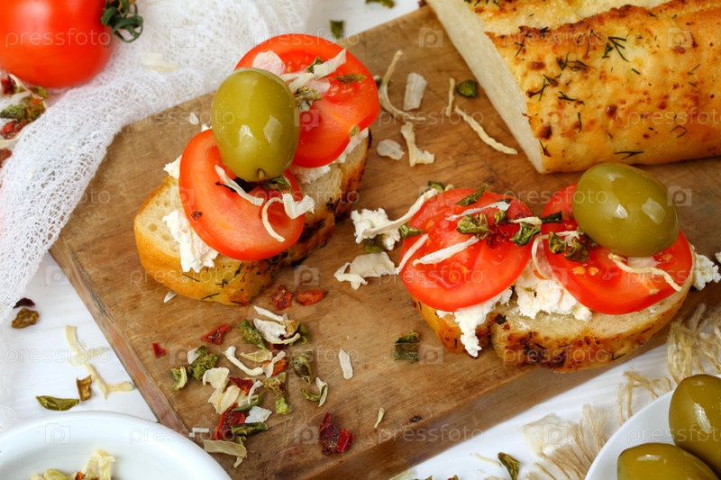 Брускетта с помидорами и козьим сыром на белом деревянном фоне