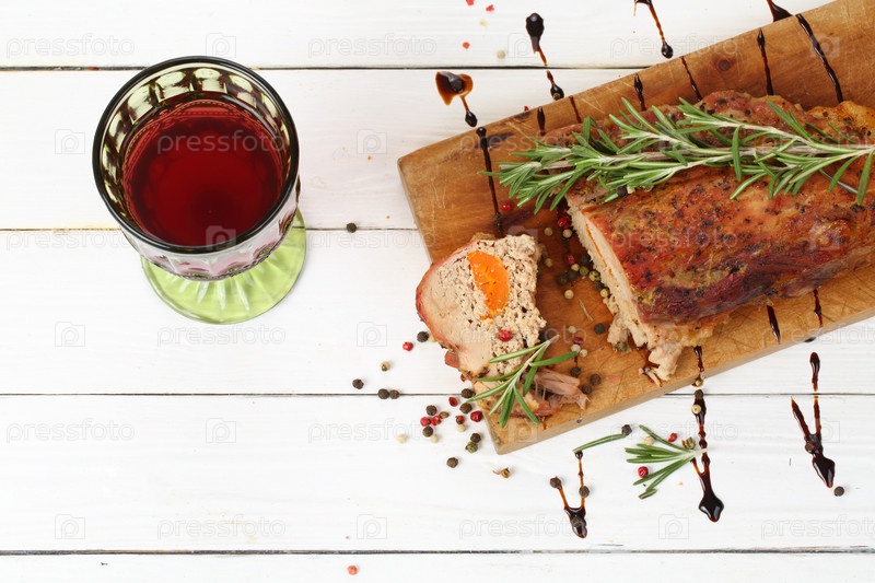 Буженина с красным вином на белом деревянном фоне