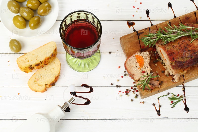 Буженина с красным вином на белом деревянном фоне