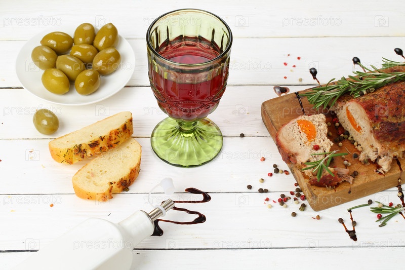Буженина с красным вином на белом деревянном фоне