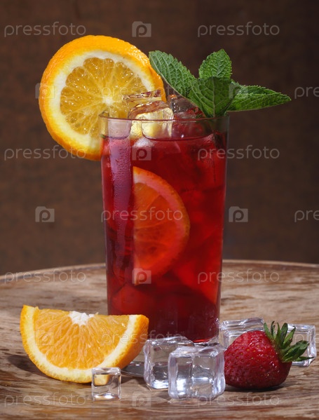 Коктейль с апельсином,мятой и клубникой на деревянном столе